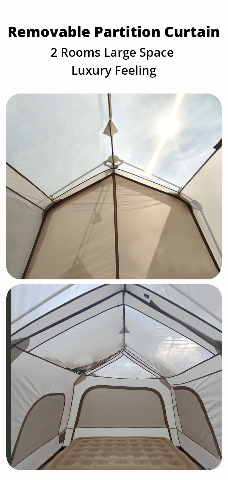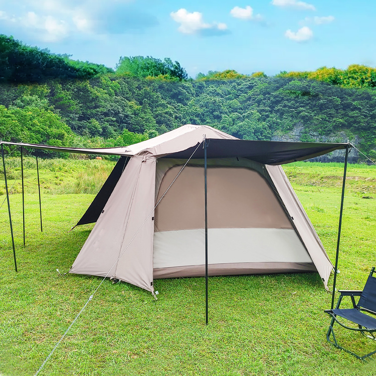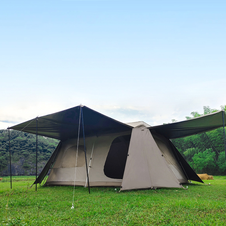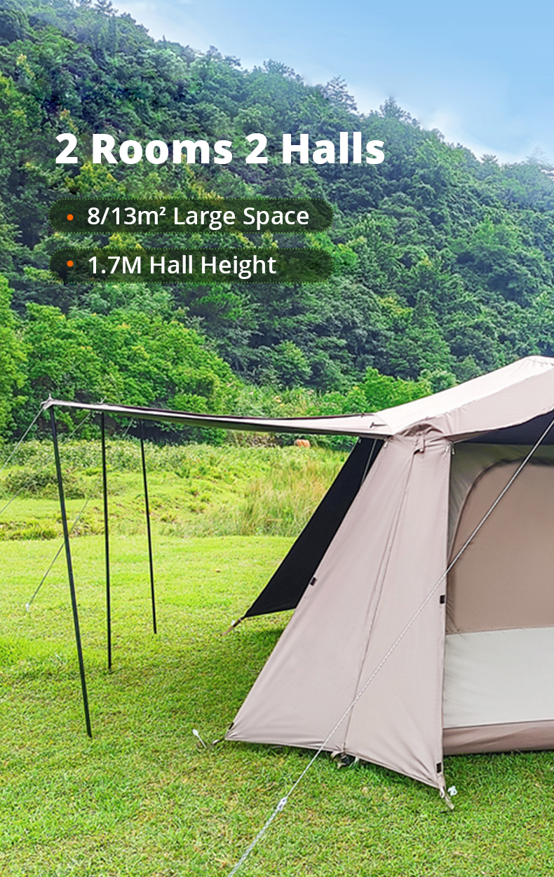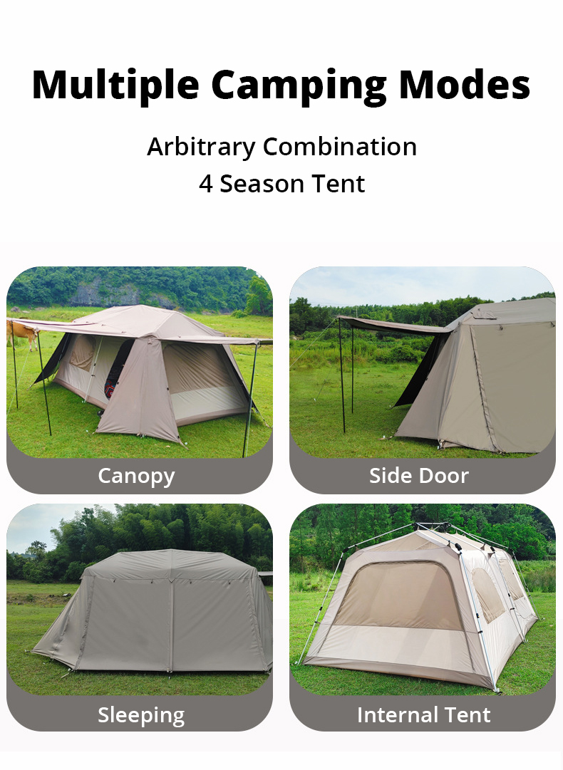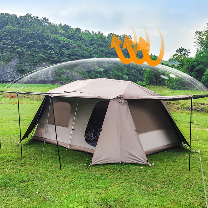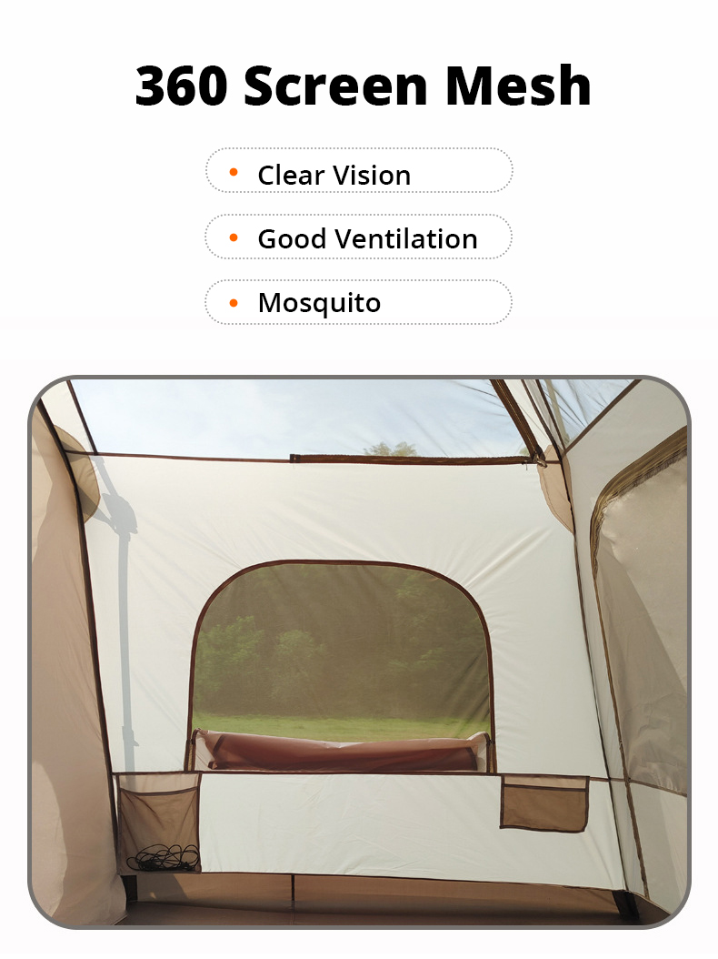 Ventilação ajustável em 5 lados: Naturalmente clara e arejada, esta barraca apresenta aberturas de ventilação em todos os quatro lados e no topo. As janelas são cobertas com malha para circulação de ar e proteção contra insetos, oferecendo um amplo campo de visão e fluxo de ar confortável.