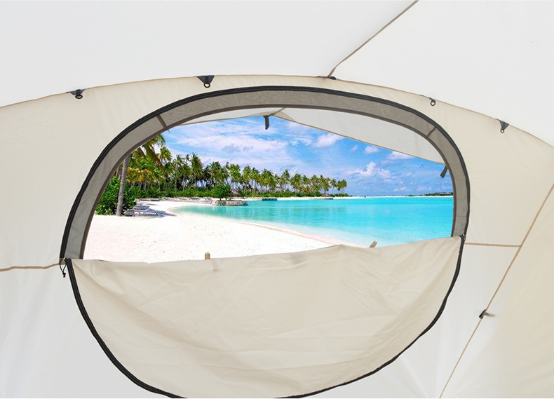 Várias funções adicionais: Grande tenda familiar com muitos extras funcionais, como suspensão de lâmpada, abertura para cabos, aberturas de ventilação e uma entrada que pode ser usada como vela solar. Persianas internas dobráveis ajudam na privacidade das grandes janelas panorâmicas.