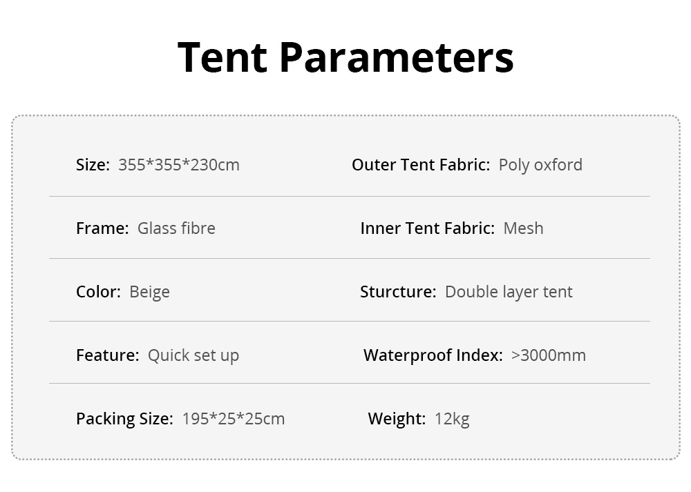ESPAÇO ESPAÇOSO: Tamanho 355x355x230 cm, acomoda até 8 pessoas, 230 cm de altura e 355 cm de largura, com 123 metros quadrados de espaço. Amplo espaço para festas e atividades ao ar livre. Assim, as pessoas podem ficar em pé enquanto comem, jogam, etc.