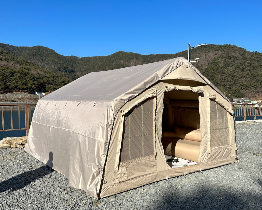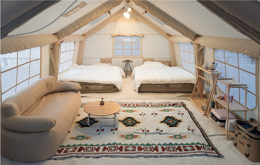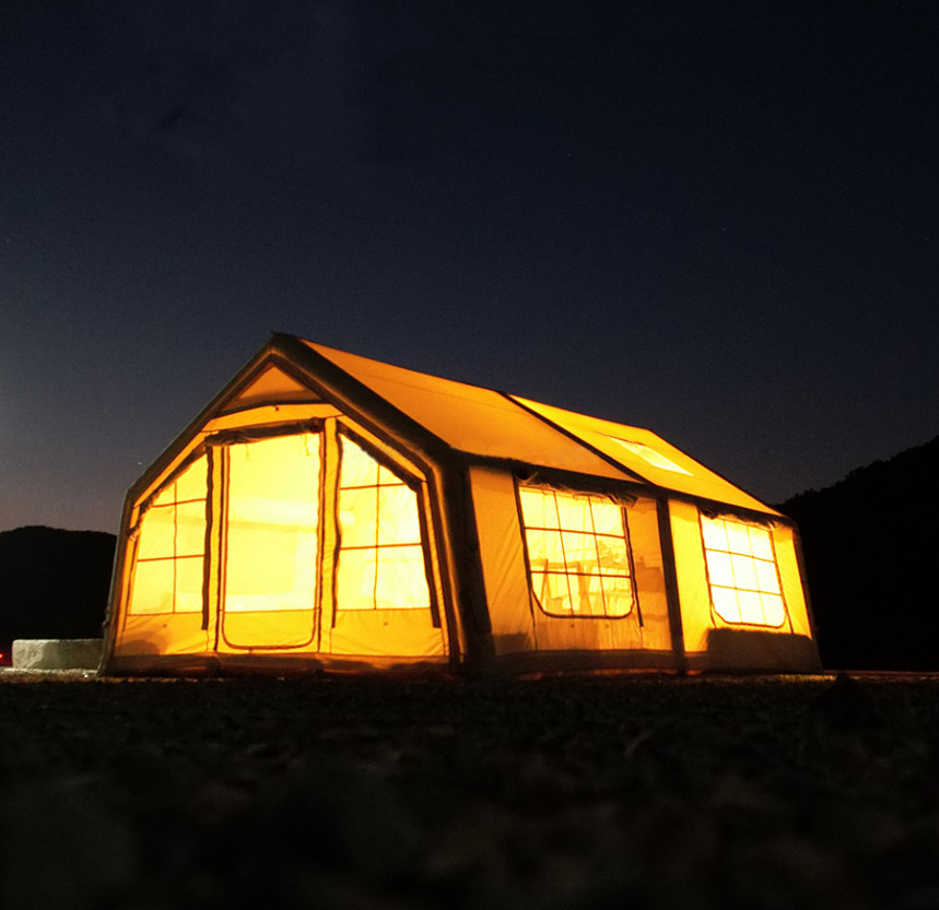 À PROVA D'ÁGUA E DE VENTO: Feita em poliéster oxford 600D ou 900D de alta qualidade, a barraca inflável para glamping oferece o equilíbrio perfeito entre leveza e durabilidade. Com excelente classificação de impermeabilidade de 3000 mm a 5000 mm, resistência aos raios UV e generosas capas de chuva nas duas janelas laterais, você sempre desfrutará de um refúgio seco, mesmo em condições climáticas adversas.