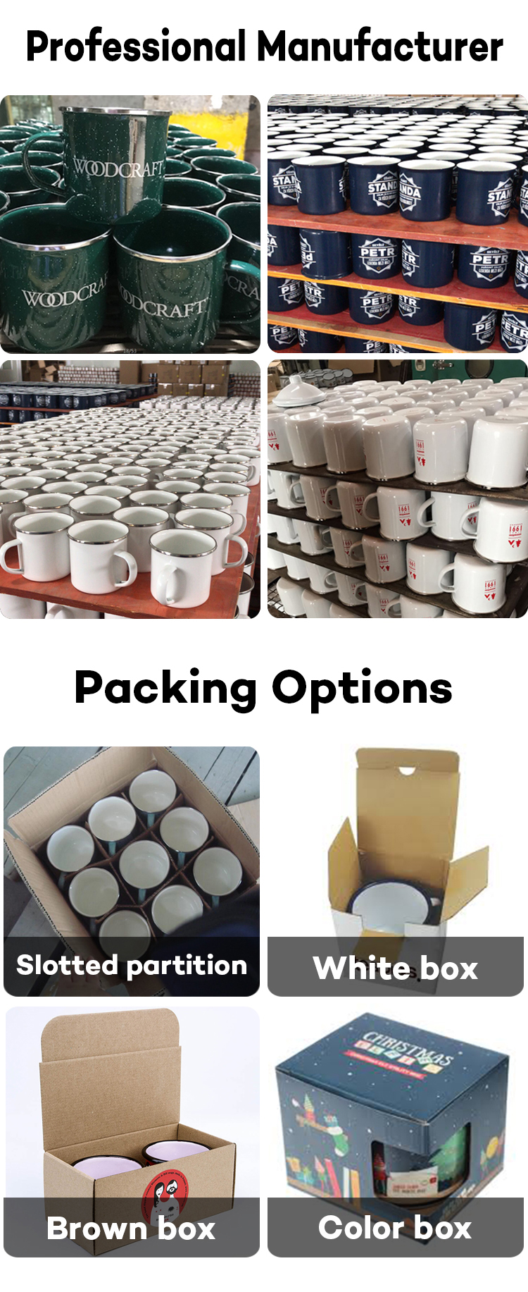 Embalagens | Cada caneca com espuma de filme branco, caixa lisa ou caixa colorida disponível. Os detalhes da embalagem estarão disponíveis na cotação oficial da CHL. |