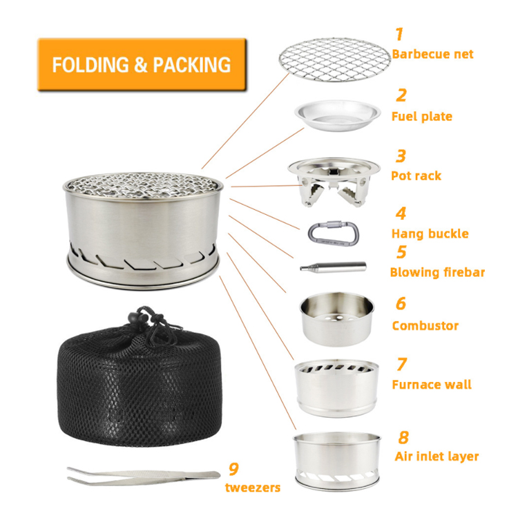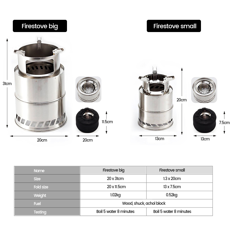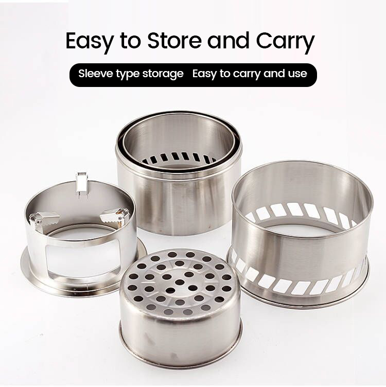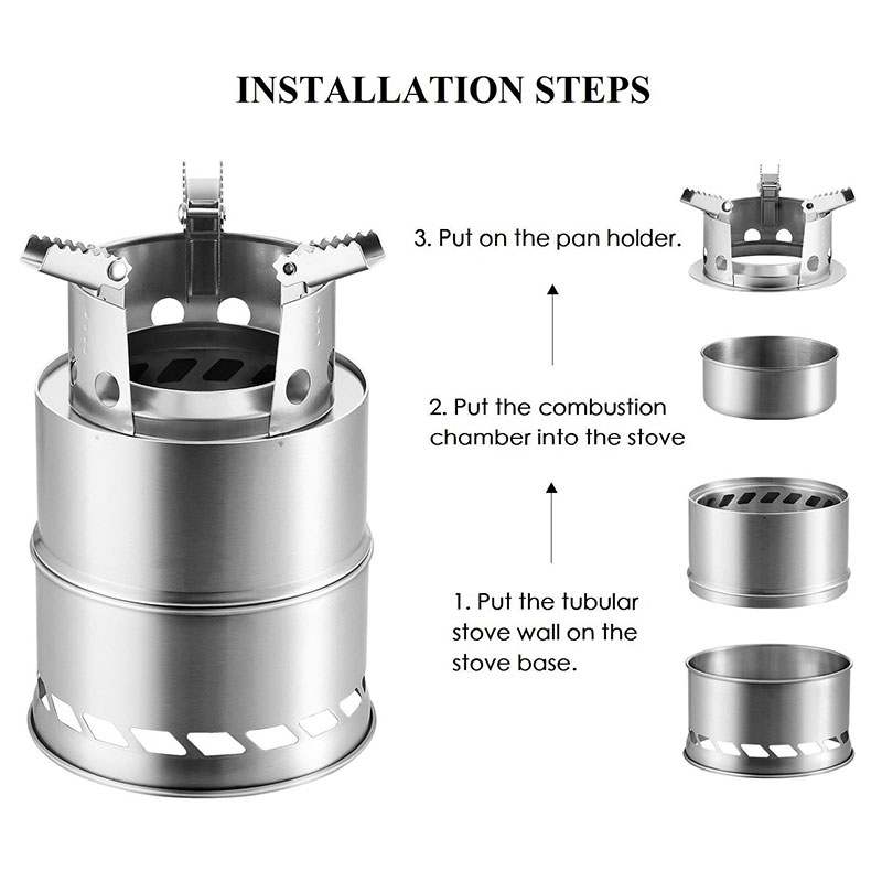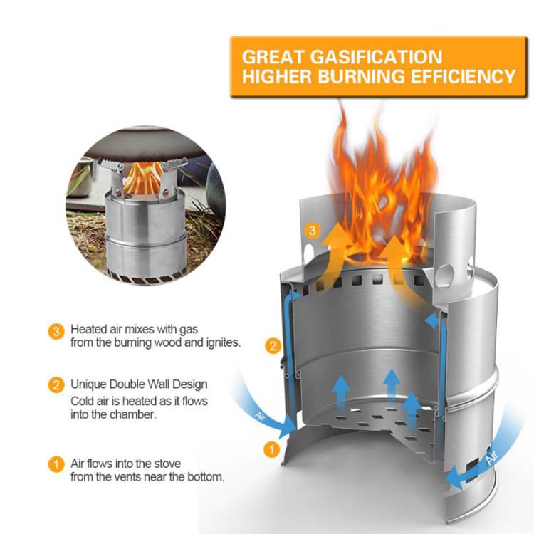 Alta eficiência térmica: a combustão secundária mantém o fogão a lenha de acampamento queimando continuamente por 20 minutos com lenha seca e lascas de madeira.