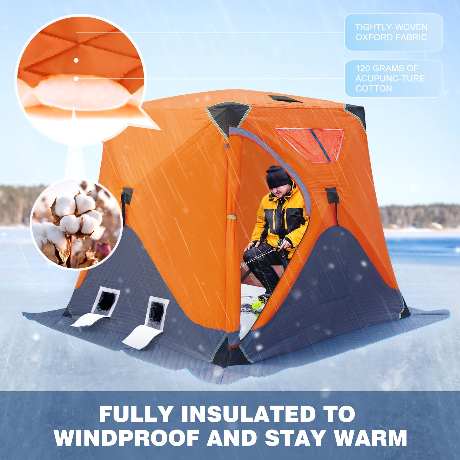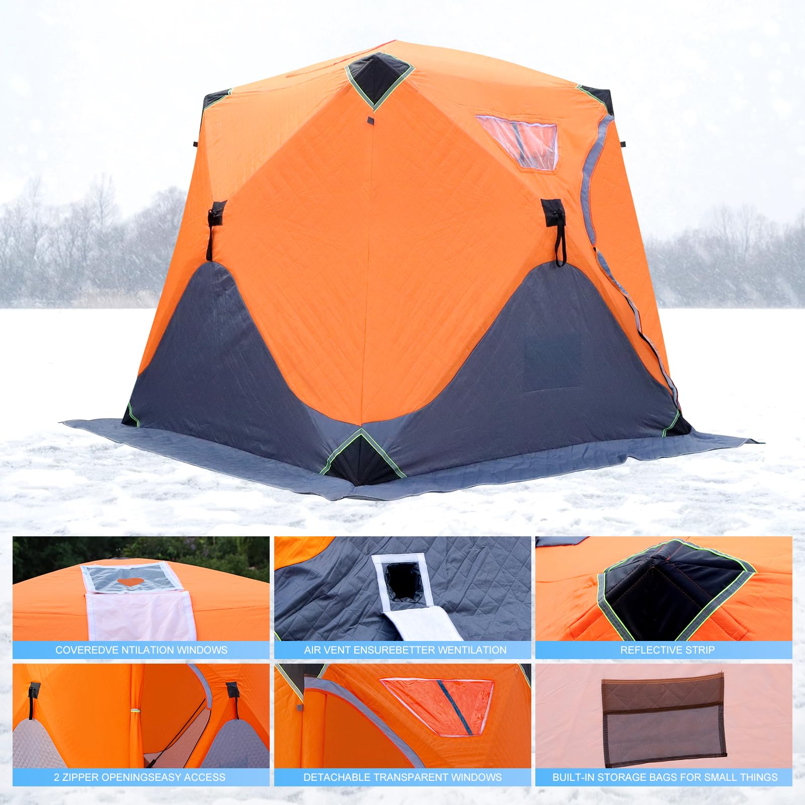 Design quente e à prova de vento Feita com tecido Oxford 600D de alta densidade, esta barraca oferece excelente resistência ao vento e à água. Em comparação com abrigos sem isolamento, sua camada isolante e saia com costura dupla proporcionam 40% mais retenção de calor, mantendo você aquecido mesmo em condições rigorosas de inverno.