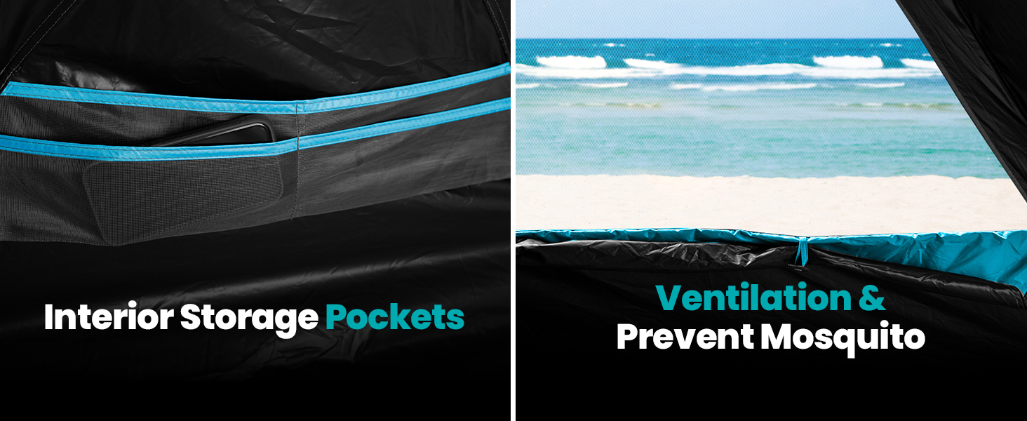 Design de tenda multifuncional: Uma porta com zíper embutida oferece privacidade para trocar de roupa. A área frontal expandida permite mais atividades, enquanto os bolsos superiores de tela mantêm os objetos de valor seguros.