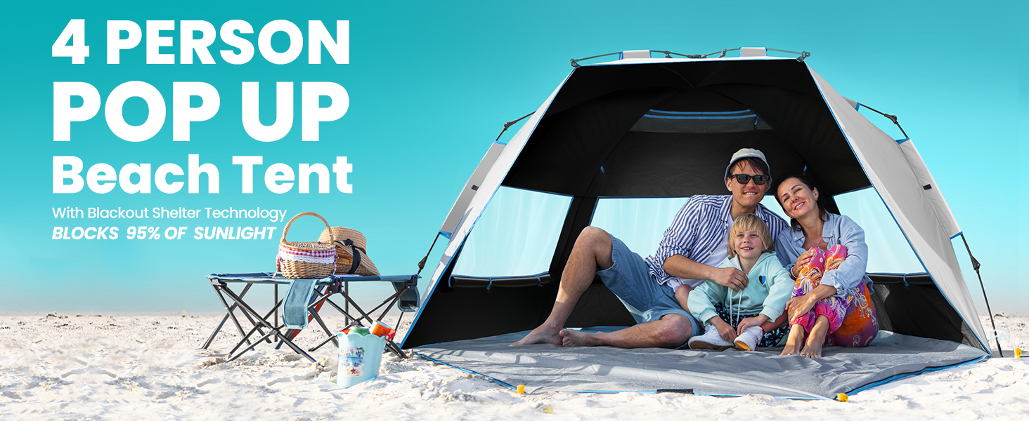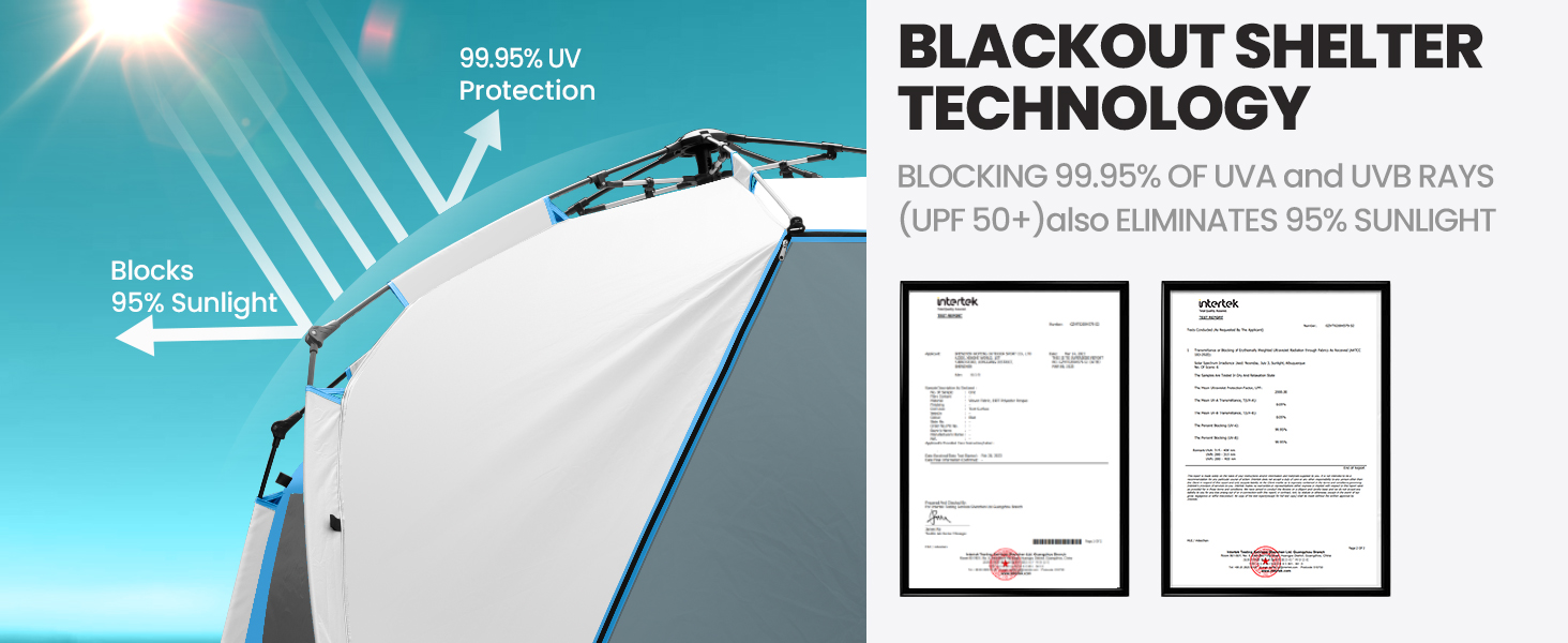 Tecnologia de abrigo blackout: Nosso abrigo com blackout instantâneo bloqueia 99.95% dos raios UVA e UVB (FPS 50+) e elimina 95% da luz solar. Isso garante a máxima proteção para sua pele e seus pertences, permitindo um descanso mais confortável a qualquer hora do dia.
