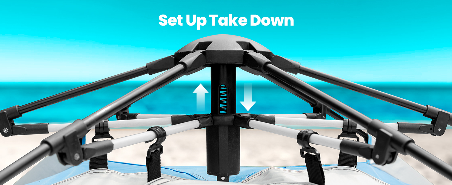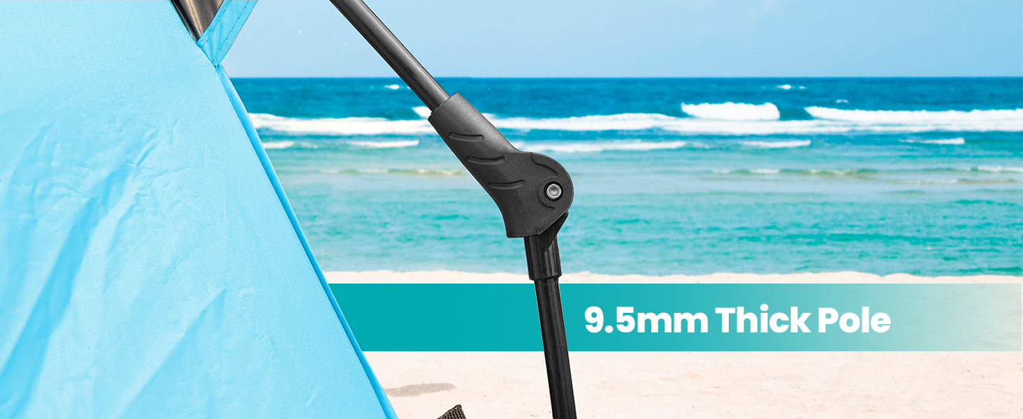 Hastes espessadas de 9.5 mm e material 190T: Com hastes reforçadas de 9.5 mm (em comparação com o padrão de mercado de 8.0 mm) e tecido têxtil Spring Asia de 190T, este abrigo solar oferece robustez superior. Permanece estável em condições de vento sem quebrar ou rasgar.
