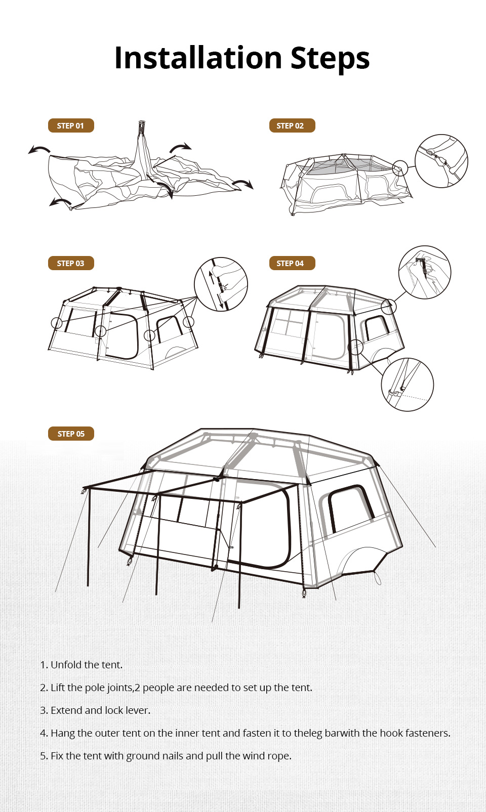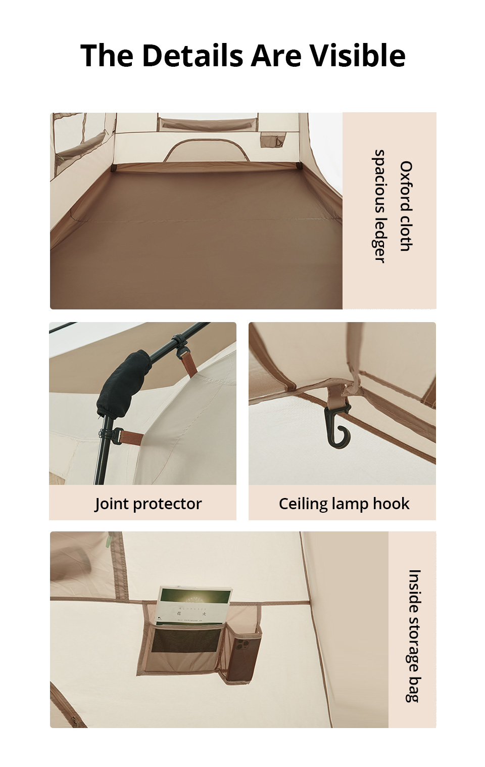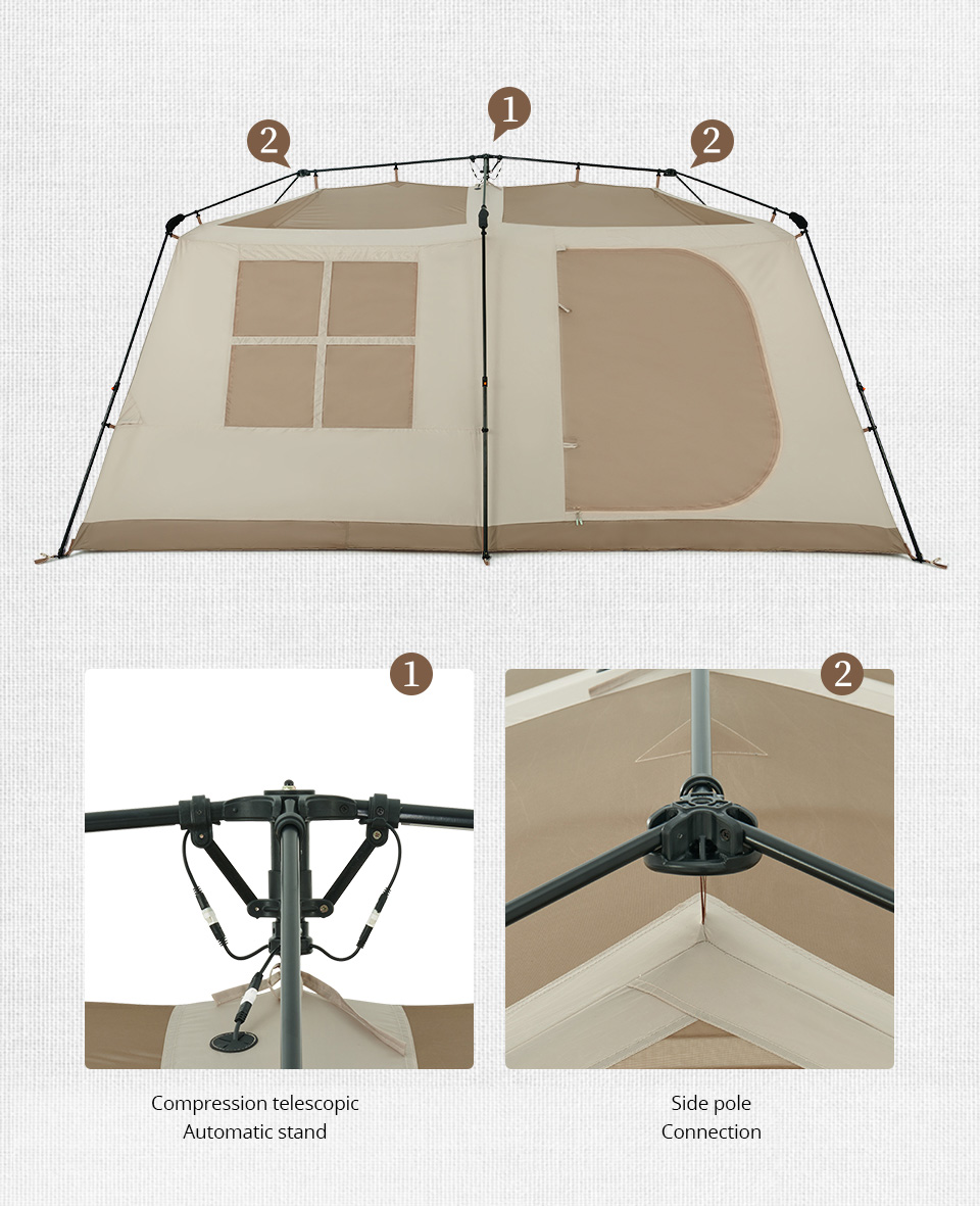 【Iluminação LED embutida】Luzes LED de parede Family Tent embutidas nos postes do teto. O corpo da tenda com postes pré-fixados que travam no lugar cria um tempo de configuração tão curto quanto 2 minutos.