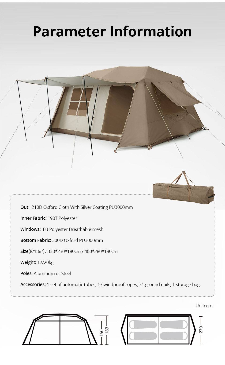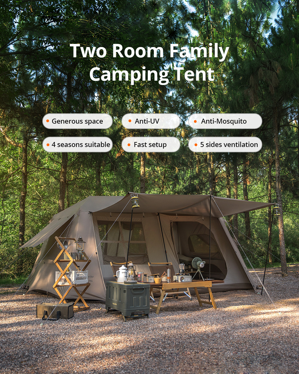 8/13㎡ Tendas de acampamento familiares de luxo com dois quartos - Abertura automática, luz LED