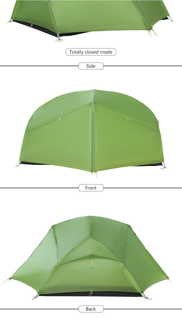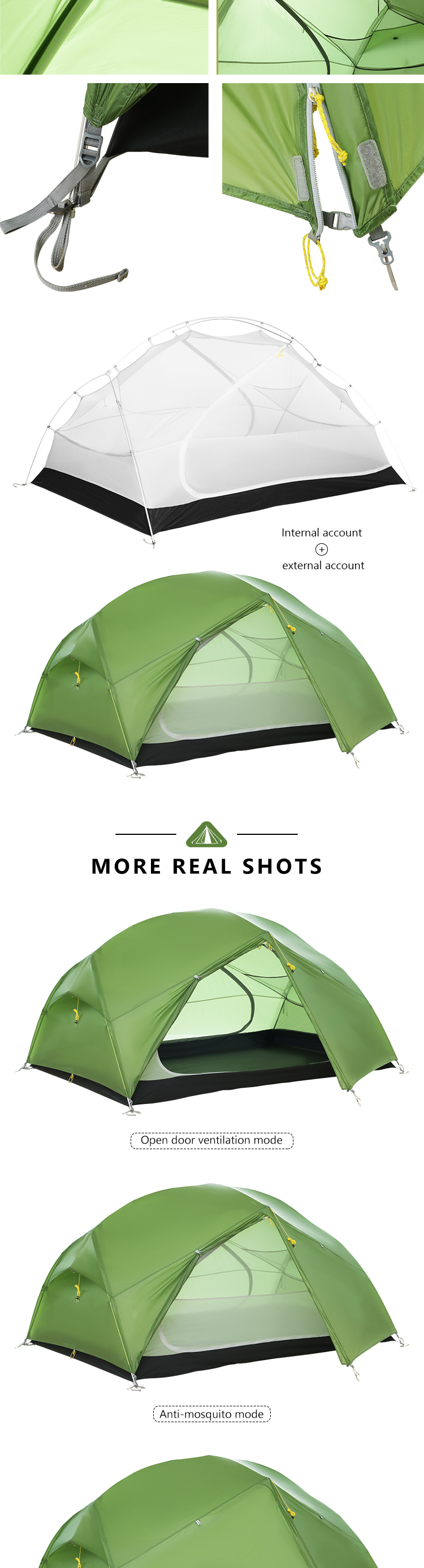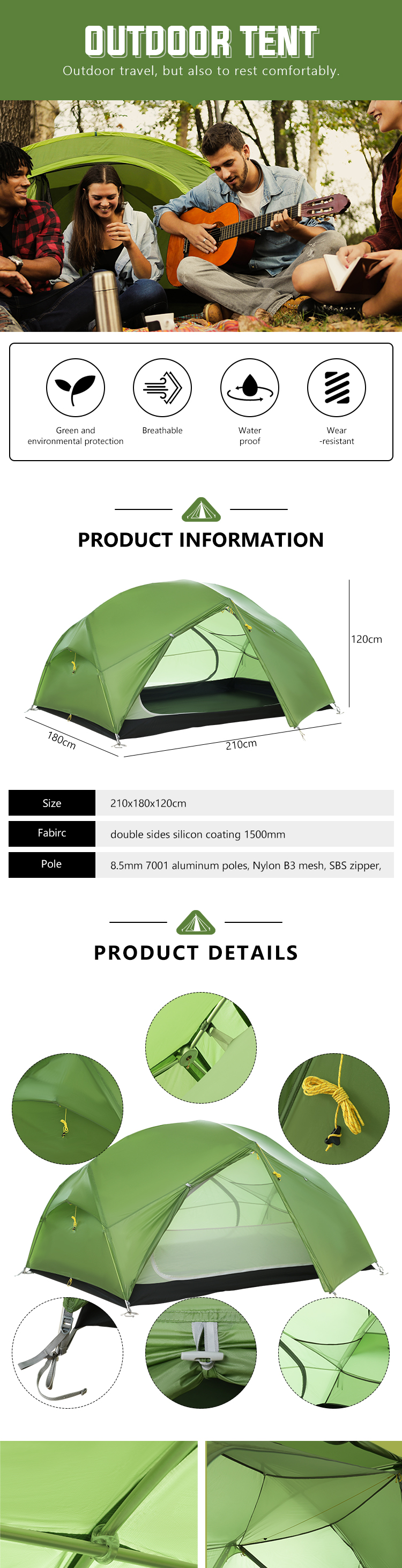 Ultraleve e resistente às intempéries: Com um design de camada dupla, a barraca externa é feita de tecido xadrez de nylon 210T (PU2000 mm) e a barraca interna é construída com malha B3 + tecido Oxford 15D (PU2000 mm). Esta barraca ultraleve oferece um abrigo seguro em tempo tempestuoso, além de proporcionar excelente respirabilidade no verão e aquecimento no inverno. Pesando apenas 2 kg (incluindo acessórios) e compacta o suficiente para caber em uma bolsa de armazenamento de 15 x 50 cm, é fácil de transportar em suas viagens.
