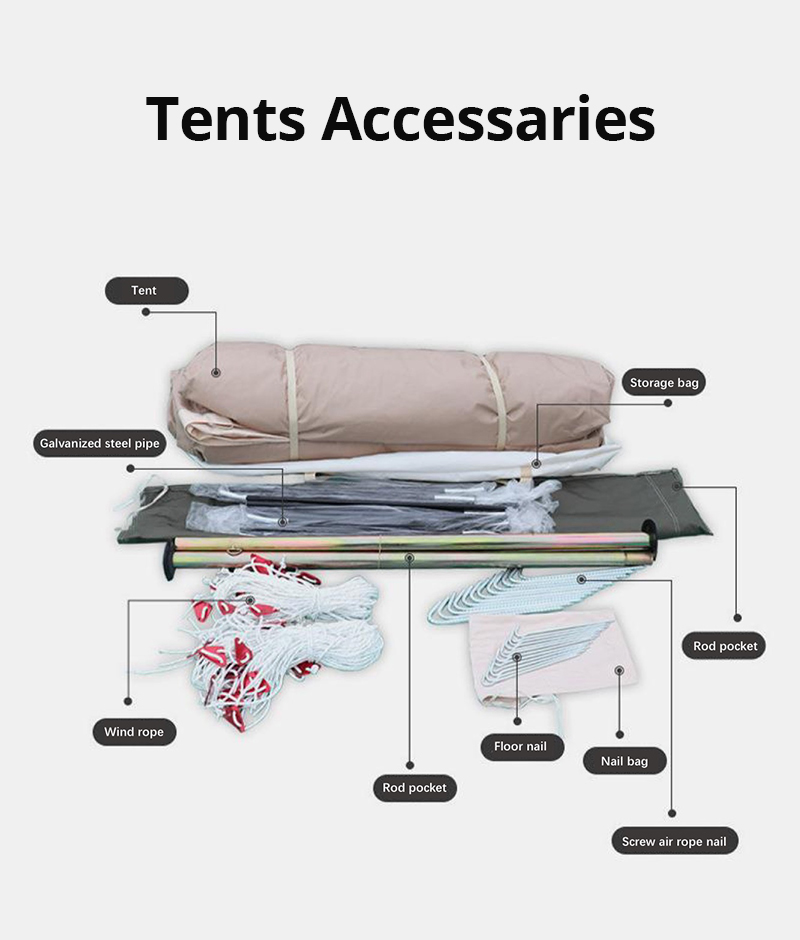 Acessórios para barraca: barraca, receptáculo, tubo de alumínio galvanizado, corda de vento, haste