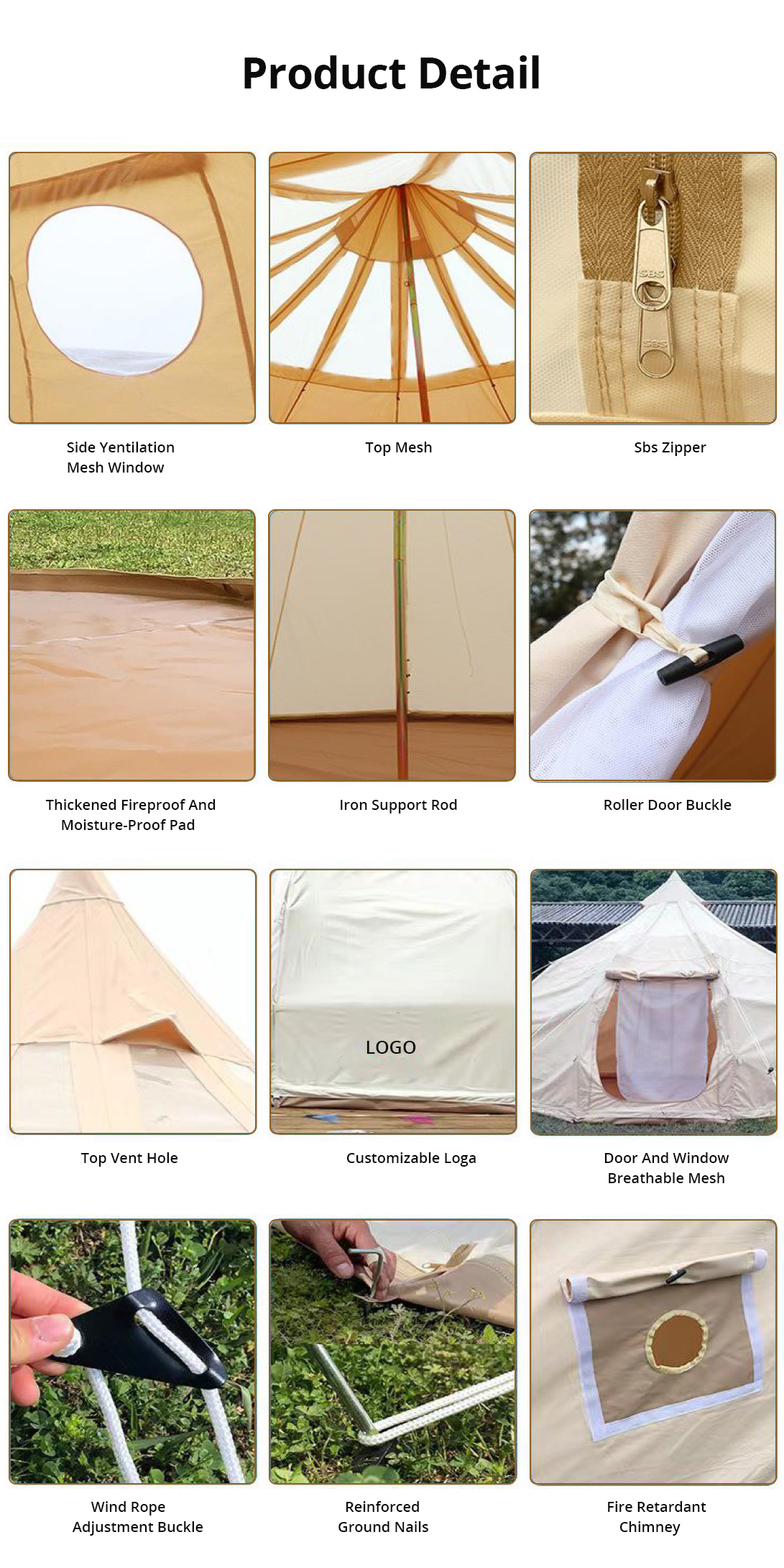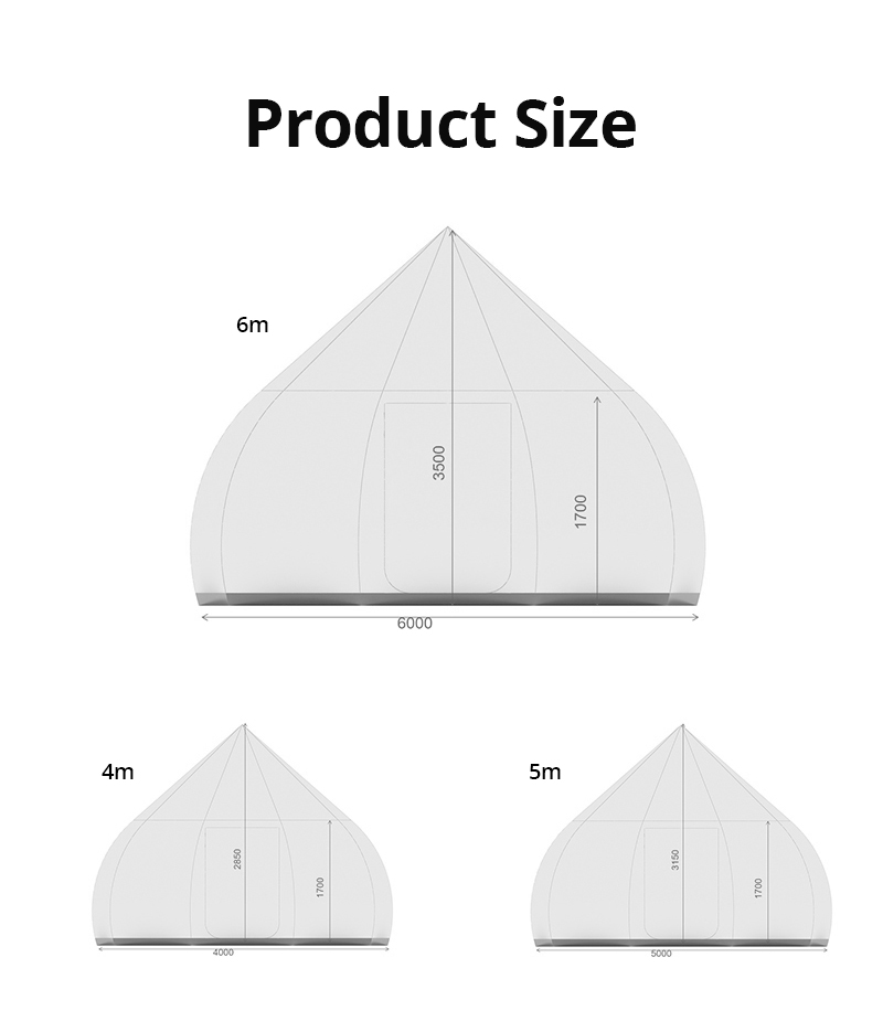【À prova d'água e à prova de fogo】Tecido Oxford 900D com revestimento de PU e 5000 mm de tecido Oxford retardante de chamas. A parte inferior da barraca é feita de tecido de PVC de 5000 g com proteção contra chamas. Esta barraca de glamping é durável, resistente ao vento e à chuva em condições climáticas variáveis e mantém o interior seco.