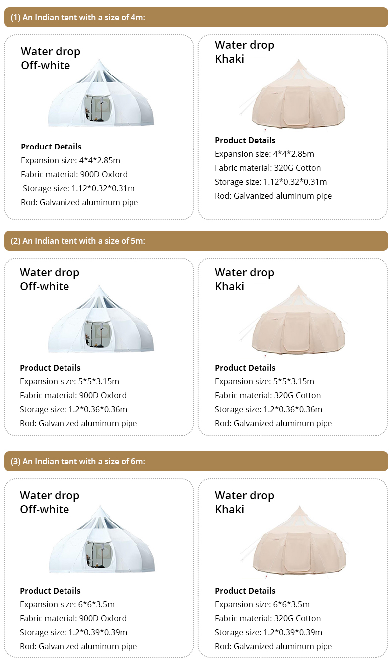 As tendas indianas são feitas de algodão e tecido Oxford. Esses dois materiais são à prova d'água e de vento,
