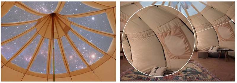 【Boa ventilação】Janelas de ventilação semicirculares, cada janela adota um design semicircular, com tela B3, que mantém todos os mosquitos afastados. O fundo e a parede são conectados por um zíper, e a parede da barraca pode ser enrolada para melhor visualização da paisagem natural externa. A boca da chaminé fica na parede para evitar vazamentos de água em dias chuvosos.