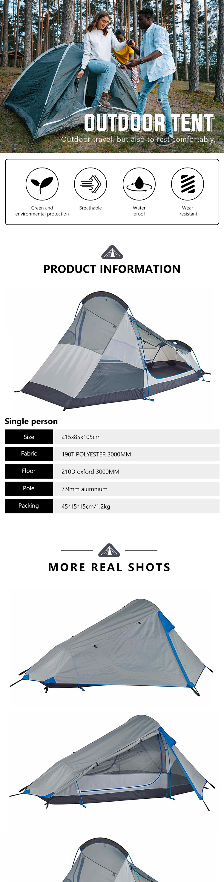 Mantenha-se seco mesmo sob chuva forte com nossa grande capa impermeável que oferece excelente proteção. O piso impermeável retém a umidade de forma eficaz, garantindo uma experiência de acampamento confortável. E não se preocupe com o vento – nossos robustos bastões de alumínio são projetados para suportar rajadas fortes sem enrolar.